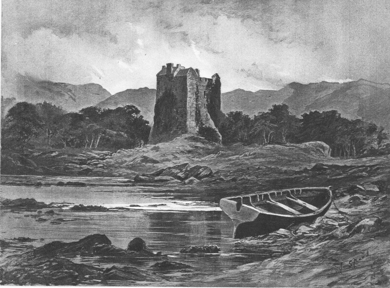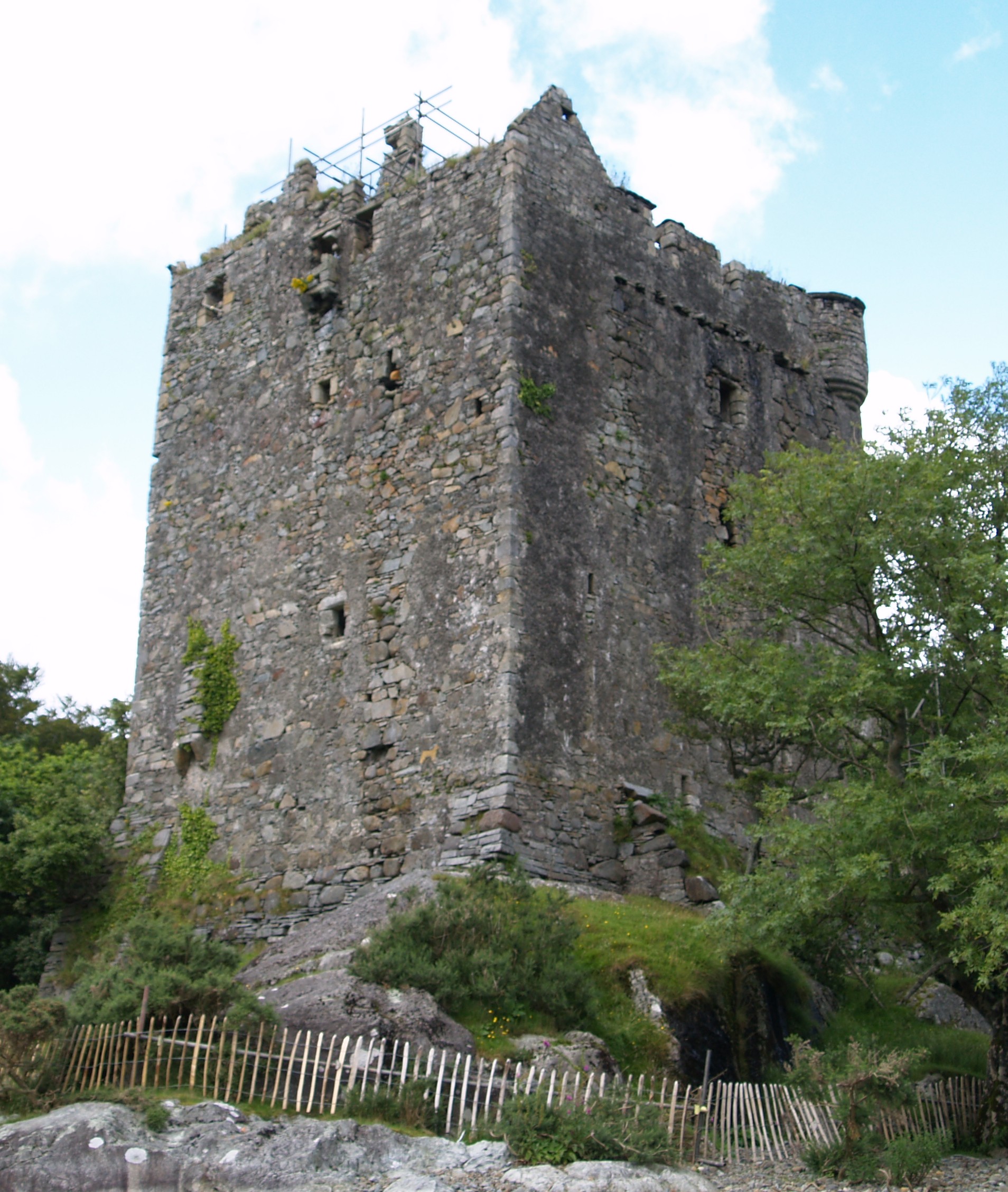 It has a three level tower with a garret. It was captured from the Macleans of Lochbuie by Clan Campbell, but later returned to the Maclaines. It was abandoned in 1752 when a Lochbuie house was originally built.